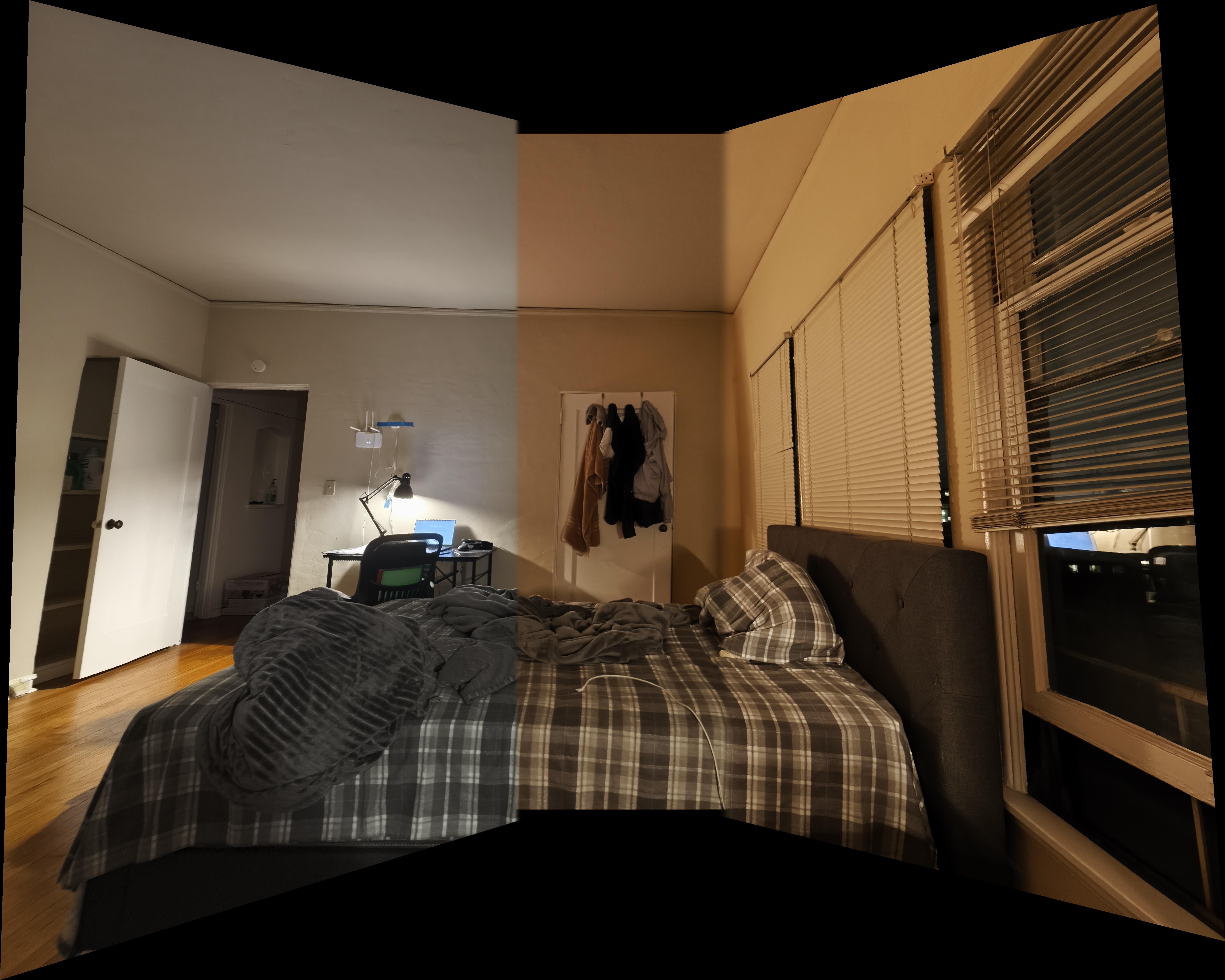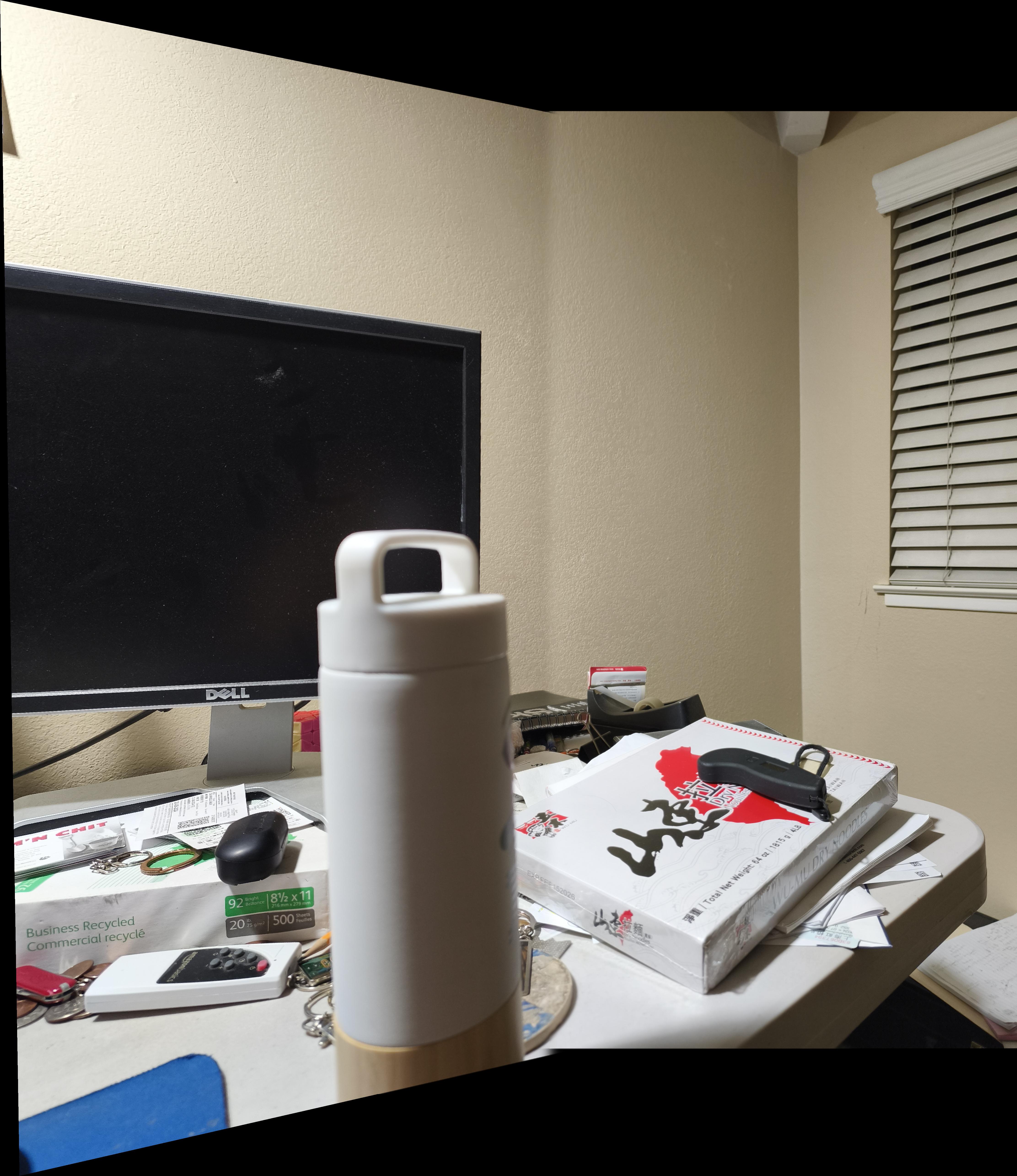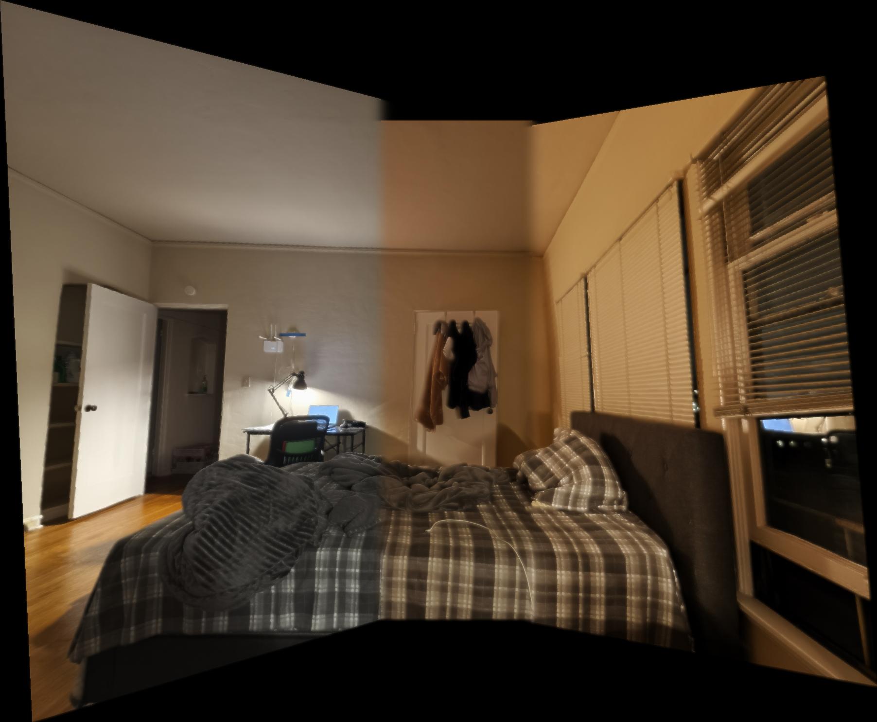 My phone camera seems to auto adjust the lighting after taking a photo, and I do not know how to turn off this feature. Therefore, my photos that I stitched together seems to have different lighting even though they were taken in the same setting at the same time. This caused the images look a bit funky after the stitching process. I tried my best to take photos in a setting where the auto color correction wouldn’t change too much in between photos, but it is still a tiny bit noticable in some photos. Maybe I can code an auto color correction algorithm such that the images are in the relatively same lighting in the future to fix this.