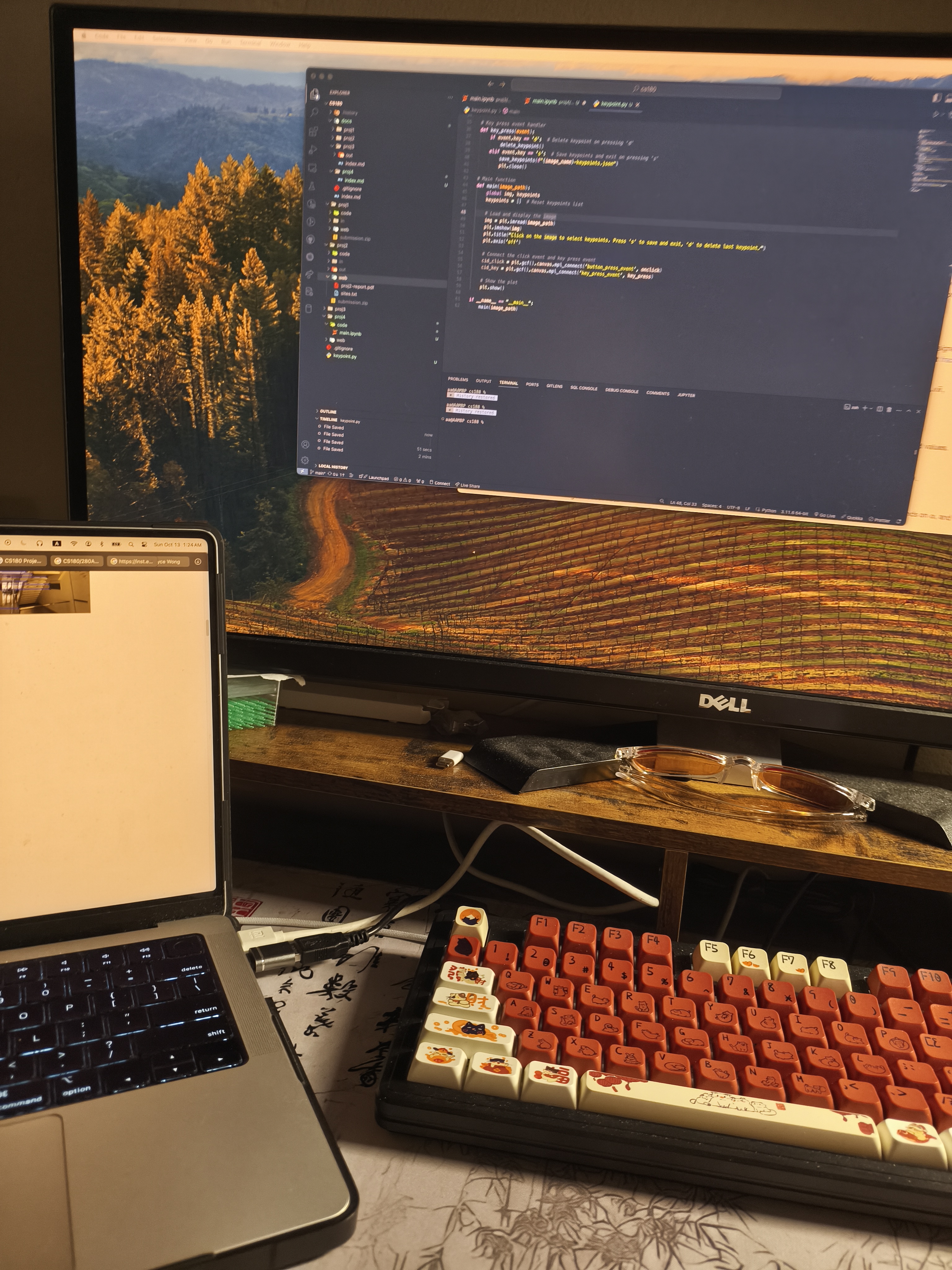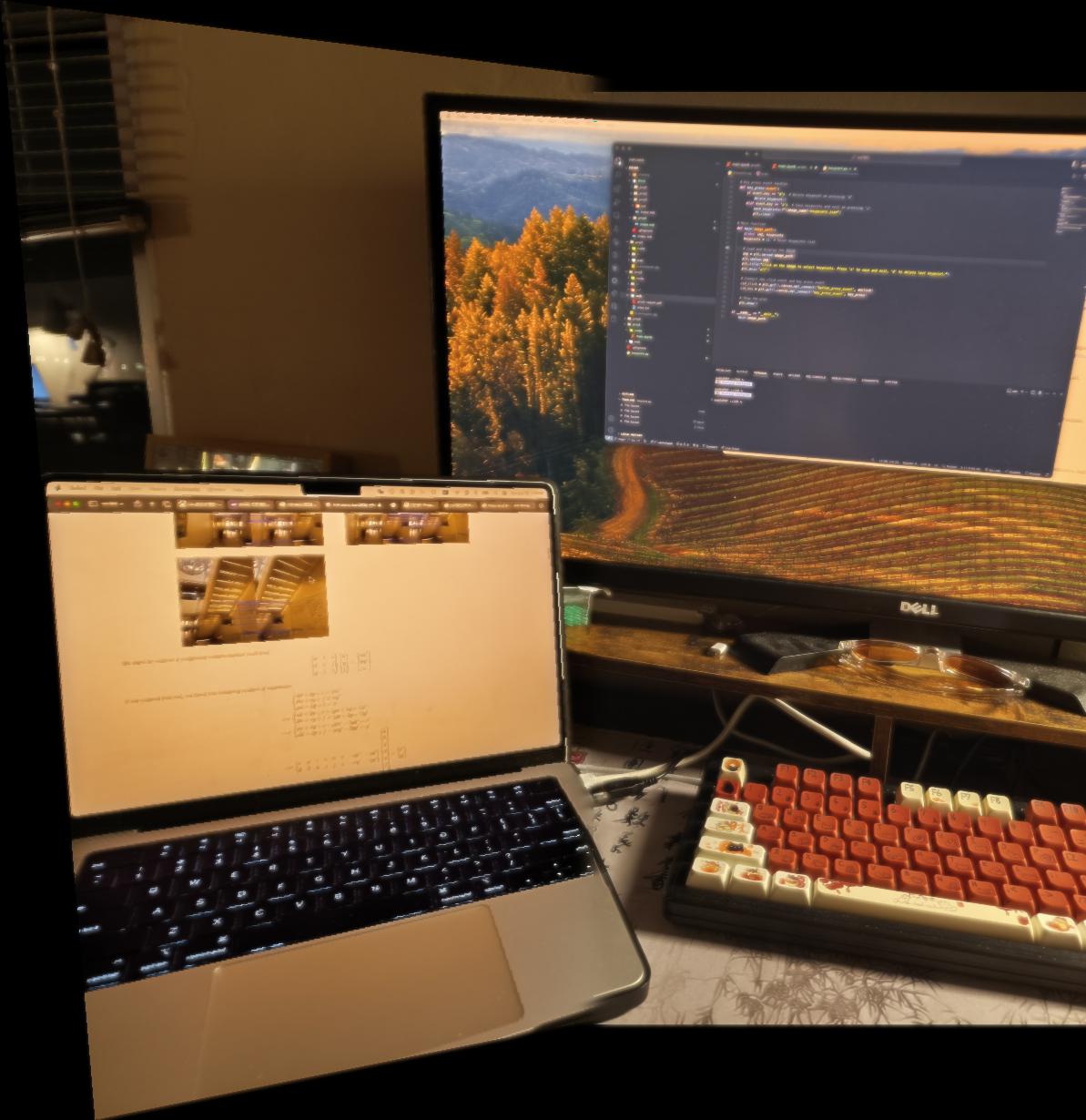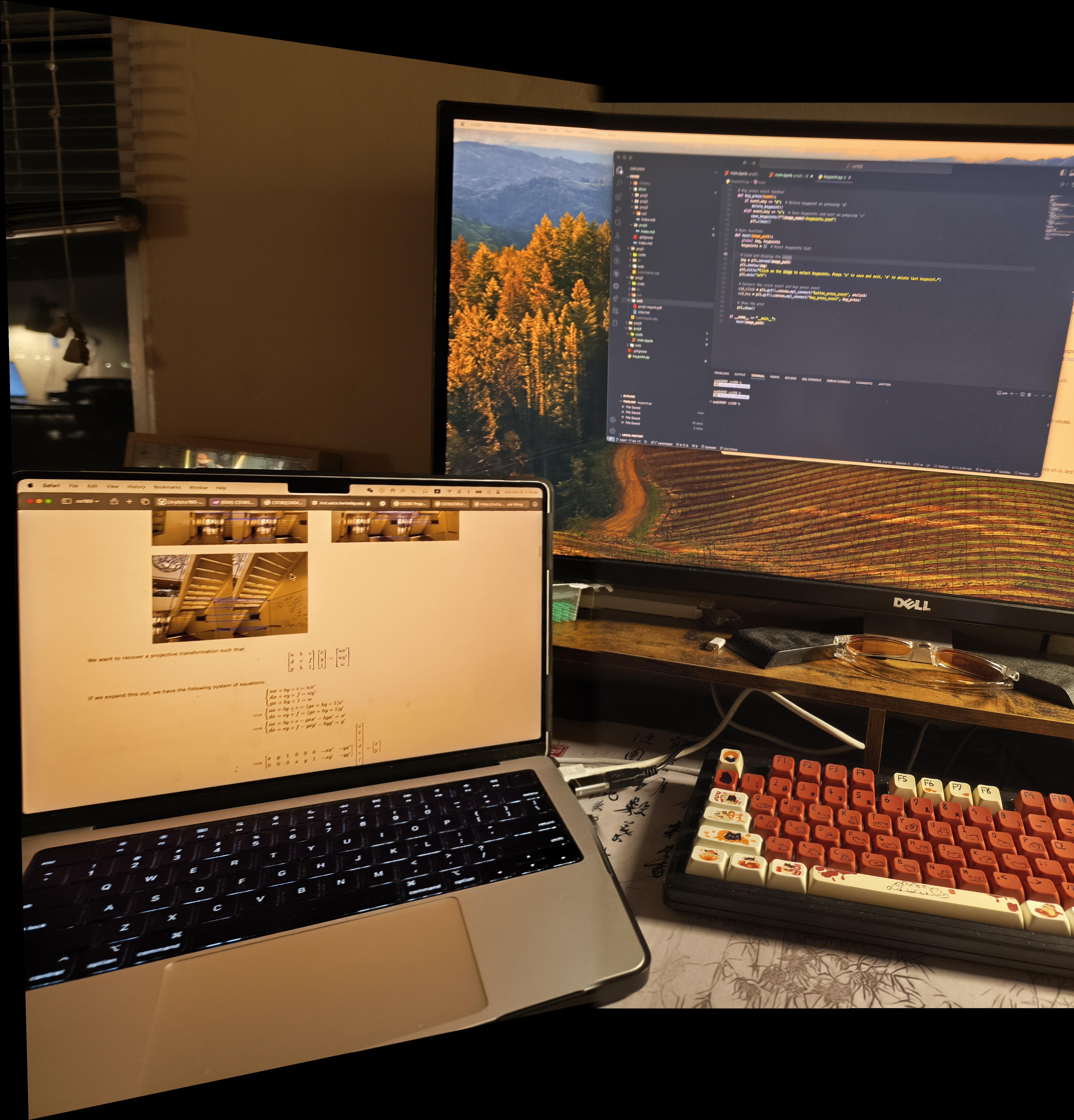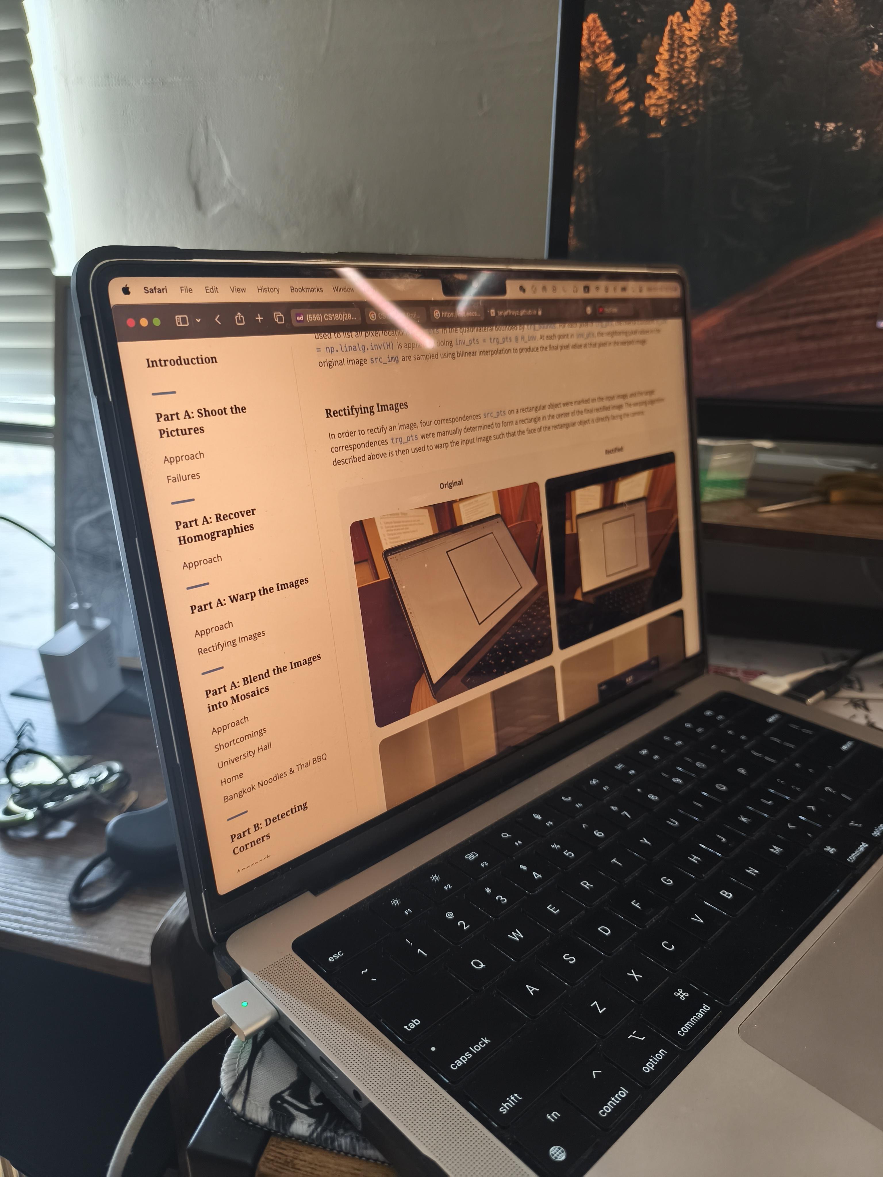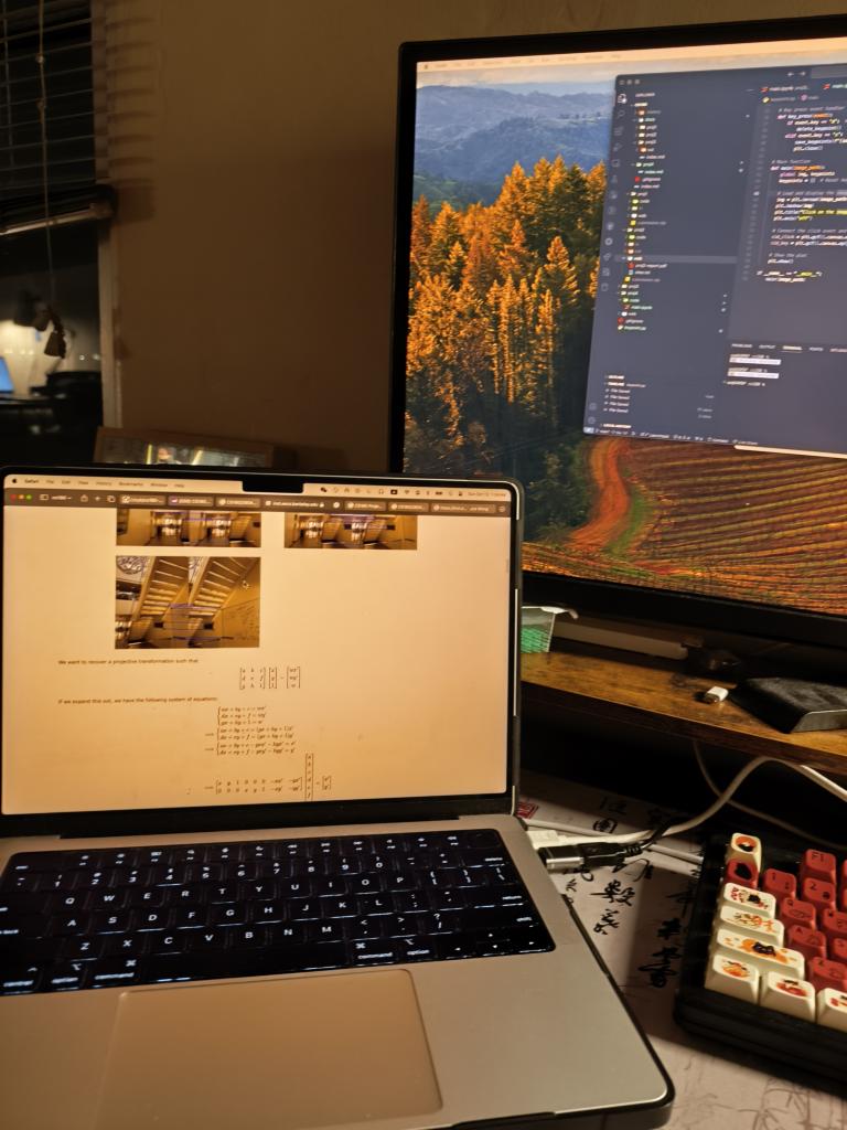 I overall enjoyed taking photos and then stitching the images into mosaics. I had some trouble getting the images to have the same lighting, due to the nature of my phone camera which auto adjusts the image after it being taken. Furthermore the images taken from different angles affected how much light the camera was receiving and therefore may have affected the lighting of the photos and mad the stiching look weird and the photos with different lighting. I think I could’ve implemented an auto color correction or averaging algorithm between the images to solve this issue from a software standpoint, but I didn’t have enough time to implement this during this project due to the heavy courseload I’m taking this semester. Maybe I will come back later, to try to implement a better stitching algorithm as well as a color correction algorithm.