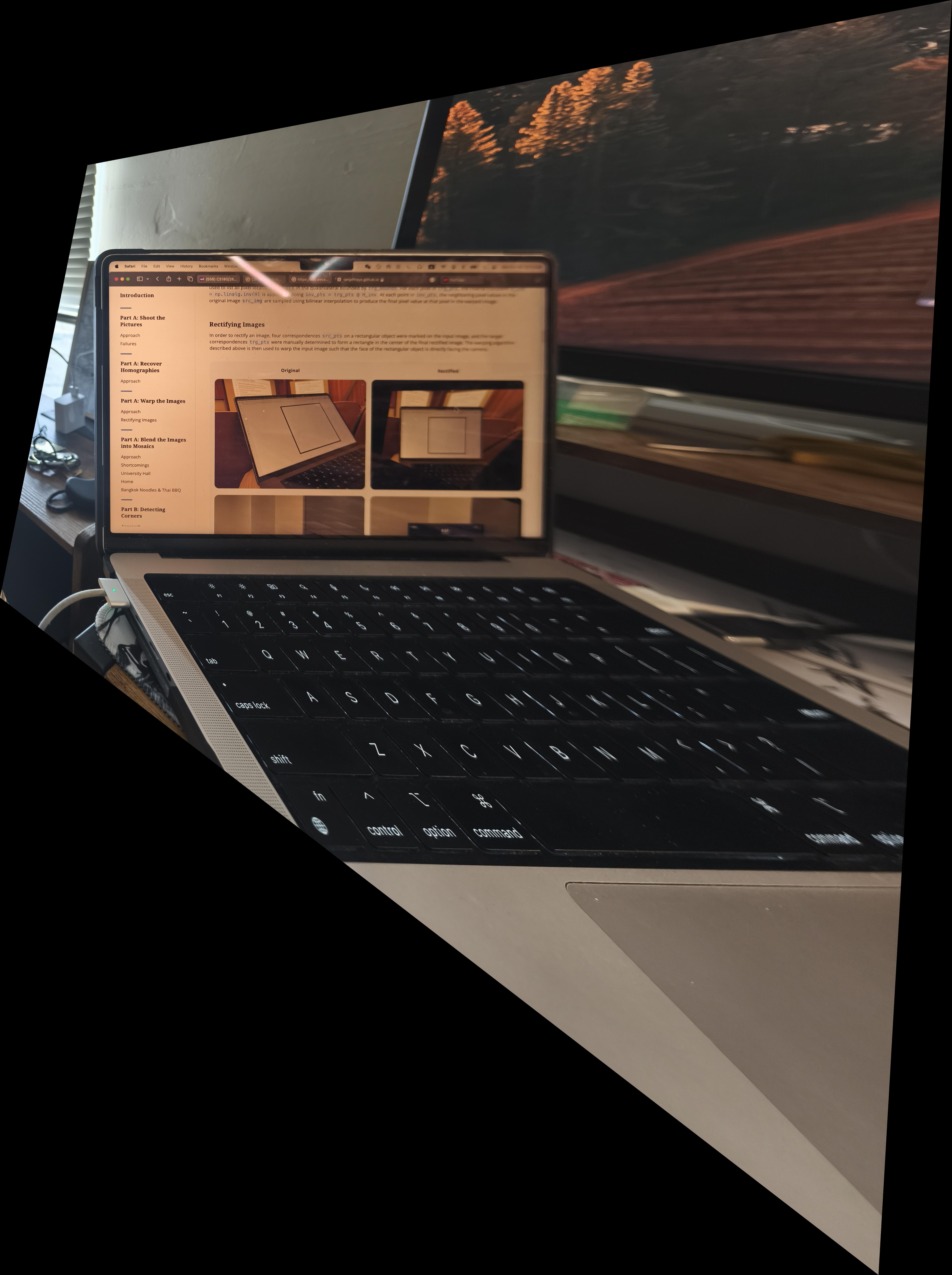 To test the homography matrices, I first took some photos of rectangular objects at an angle and then warped those images to rectangles (aka rectifying them). Just to note, the src_points of computeHomography come from keypoints mapped on the angled photo while the dest_points of computeHomography is just some points that form a rectangle that is relative to the size of the image.